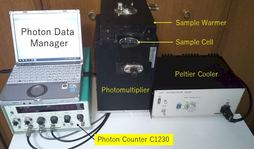 浜松ホトニクス社製のPhoton Counter C1230に水冷とペルチェ素子による冷却によって低雑音化した高感度の光電子増倍管を接続してサンプルからの極微弱発光を検出するシステムです。C1230には正面に表示されるフォトンカウント値を背面から独自のパラレルインターフェースで出力する機能があるため、それをカウント毎にバイナリ値に変換しつつUSBを介してWindows10パソコンに入力可能なインターフェースを独自に開発しました。更に、インターフェースから得られる値を収集・解析するソフトウェア(Photon